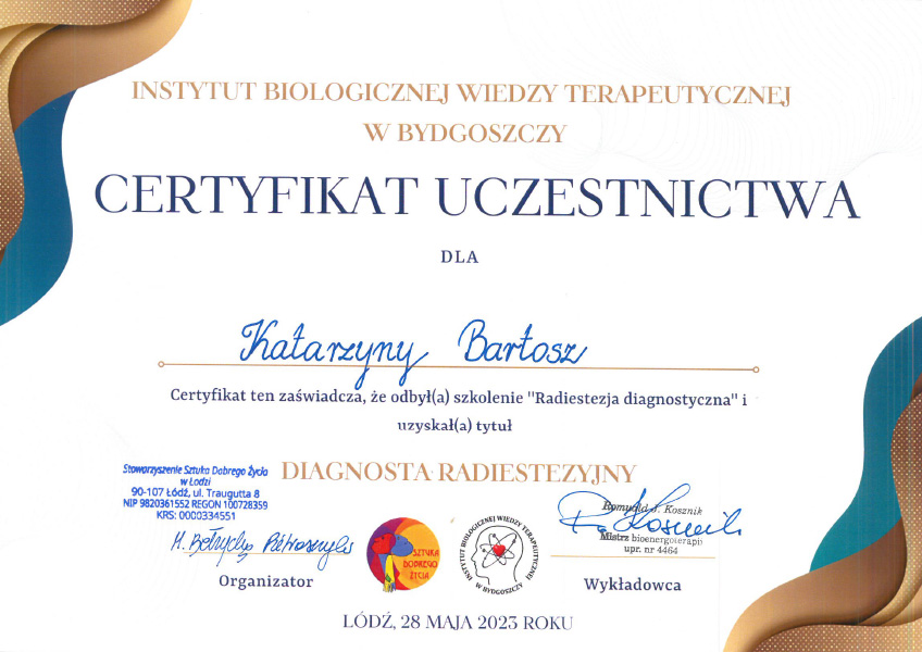 Przez długi czas szukałam sposobu, aby poczuć się lepiej zarówno fizycznie jak i psychicznie. Spotkanie z p. Kasia okazało się przełomem. Jej spokój i indywidualne podejście sprawiły, że z każdym kolejnym spotkaniem wracała siła i nadzieje. Ból w obrębie stawów znikł po zastosowaniu wskazówek jakie dostałam od p. Kasi. Od 5 lat cierpię na RZS. Po zastosowaniu diety i odpowiedniej suplementacji bóle znacząco się zmniejszyły. Wróciła także sprawność w stawach.
