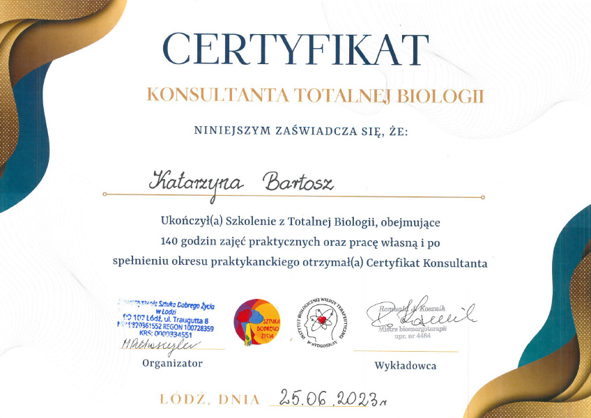 Nie wierzyłam, że można tak wiele zyskać dzięki naturalnemu wsparciu organizmu. Do p. Kasi trafiłam za namową córki. Pani Kasia wyjaśniła mi podłoże moich zaburzeń pomogła mi zrozumieć dlaczego moje ciało reaguje tak a nie inaczej. Dostałam zalecenia jak mam postępować by wspierać proces leczenia, który kontynuowałam pod opieką lekarza. Uważam, że połączenie medycyny z naturalnym podejściem do zdrowia bardzo pomogło mi stanąć na nogi.